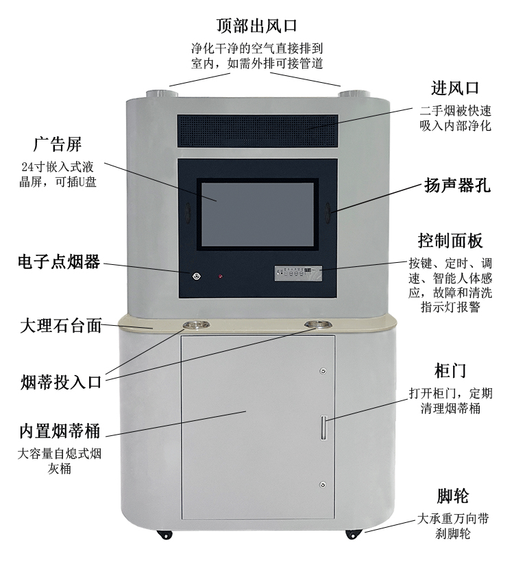 申瑞吸煙室空氣凈化機,內(nèi)置高壓靜電場(電子集塵室)+層流過濾網(wǎng)+活性炭吸附+負(fù)氧離子功能,高效凈化清新室內(nèi)空氣。